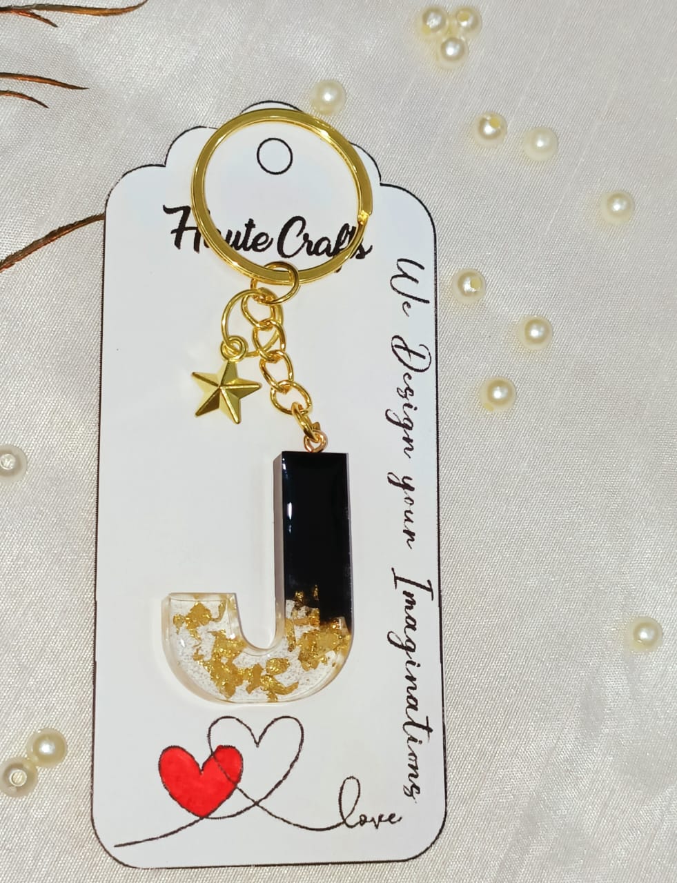 Haute Crafts Black & Golden ("J")- with Golden Star, Resin Alphabet Initial Letter Keychain Key Ring for Women Girls Purse Handbags, Bike, Car Keyring ("J")