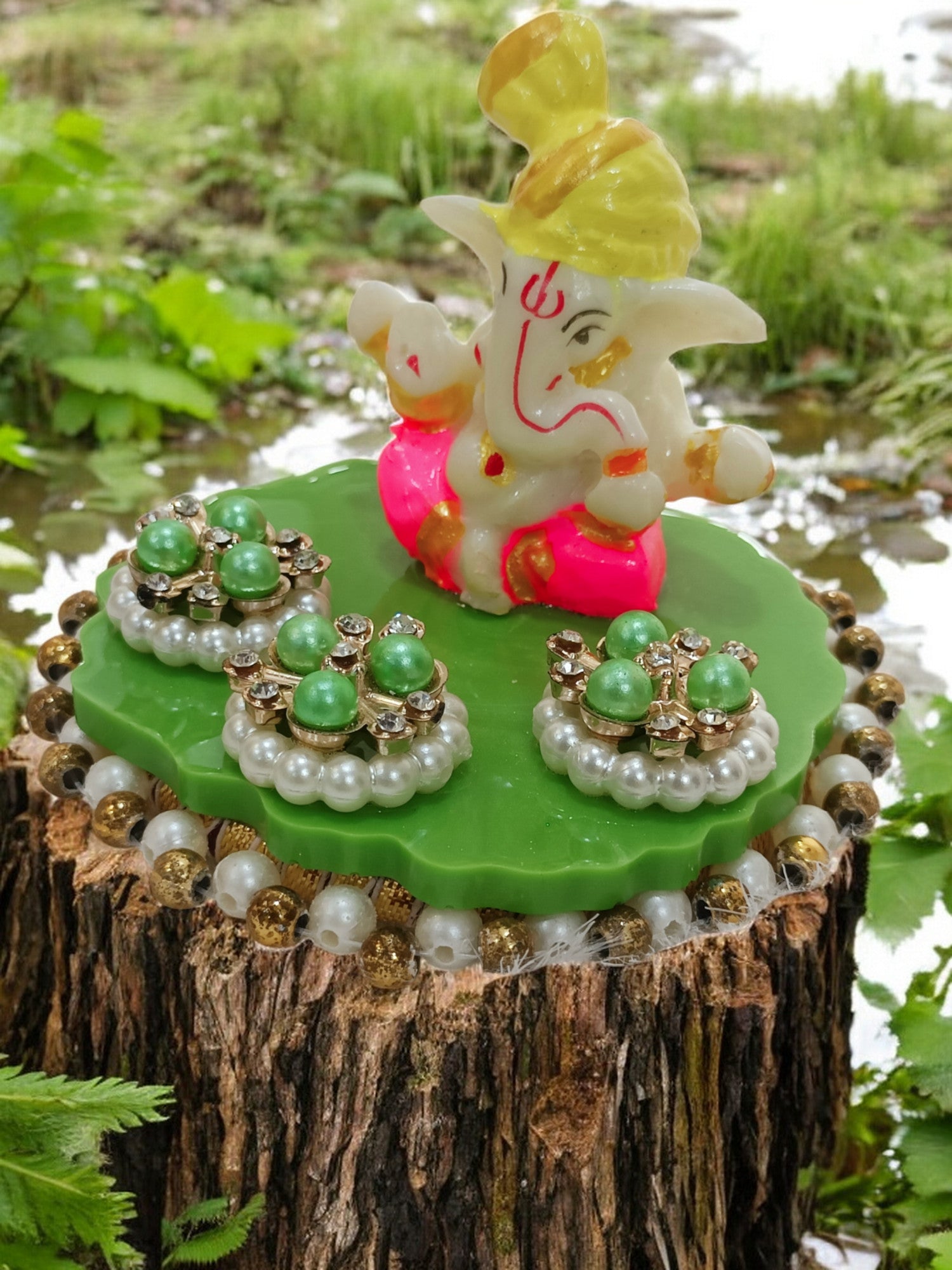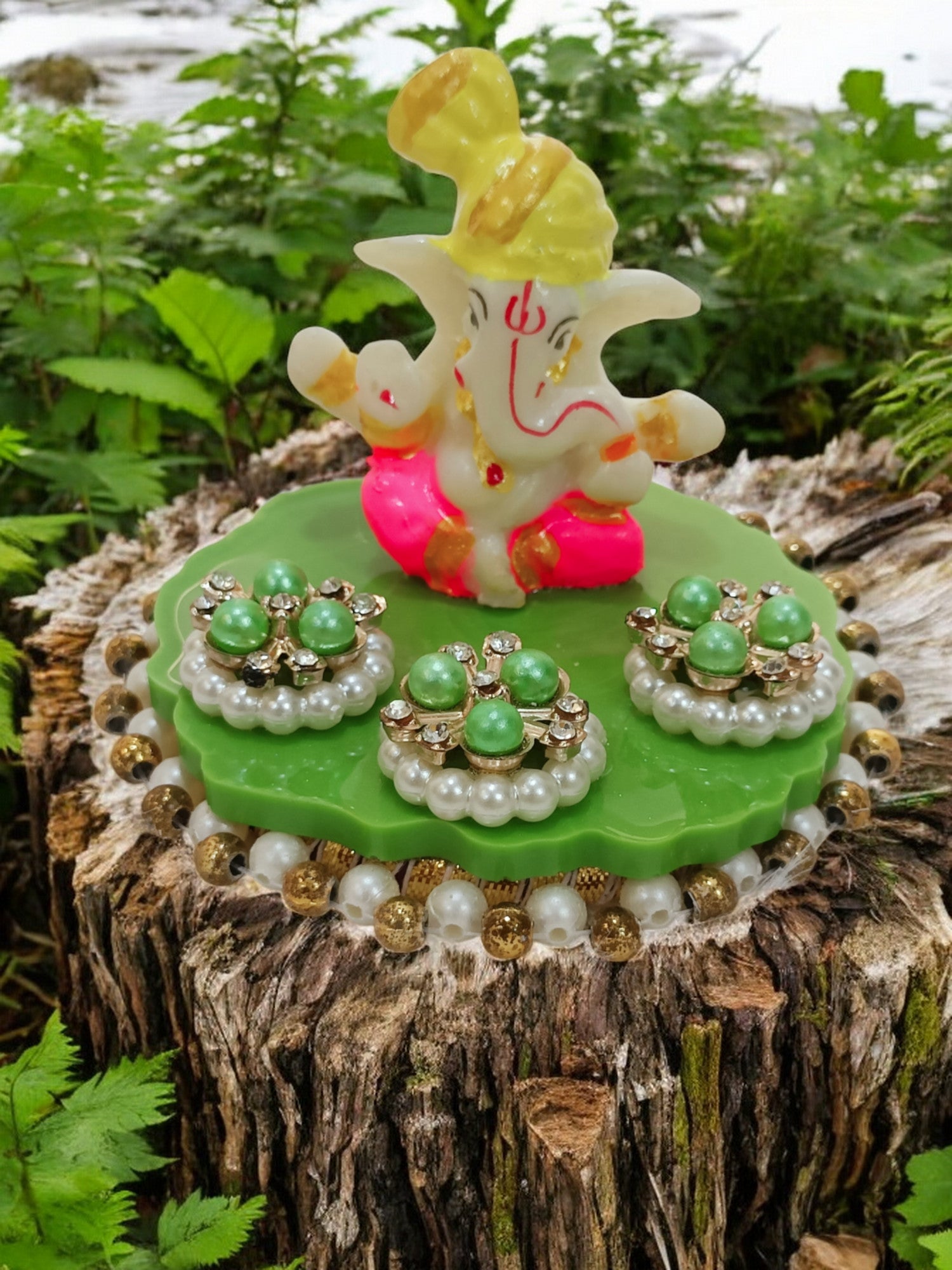 Haute Crafts Ganesh Idol with Resin Base, decorative Pearl Flower Statue for Car Dashboard Gift Lord Ganesha Ganpati Idols Showpiece Figurine for Home Pooja Room Diwali Decoration., Resin