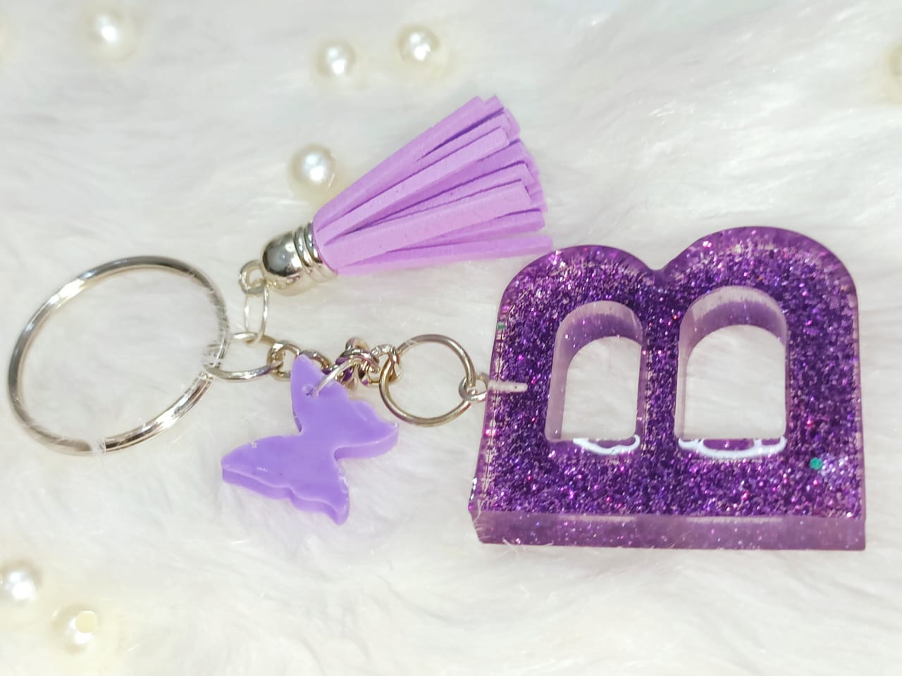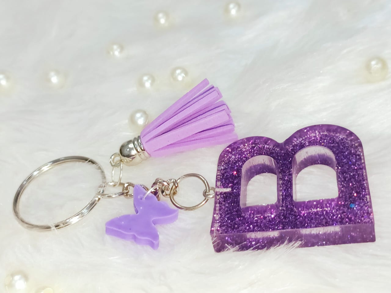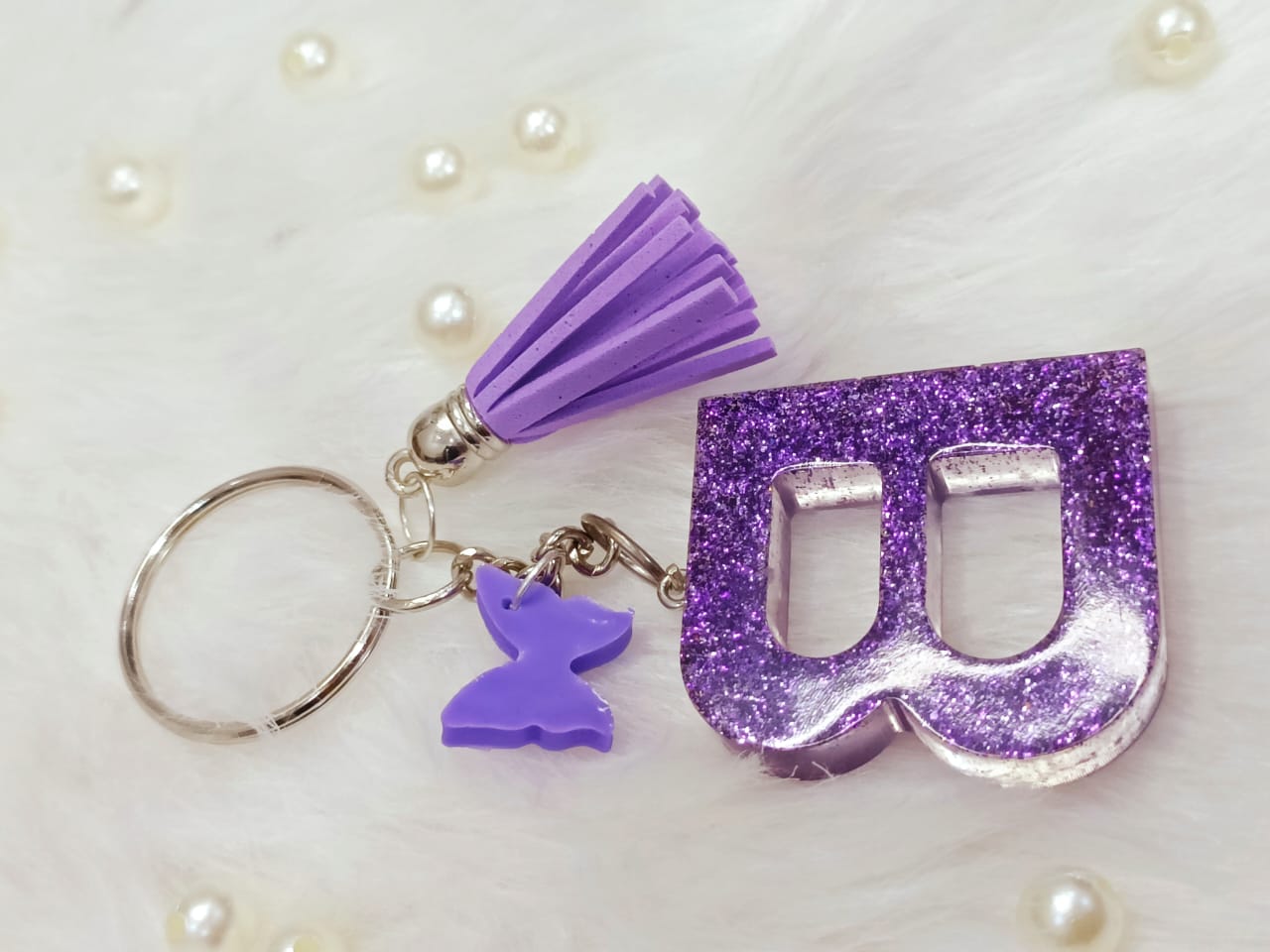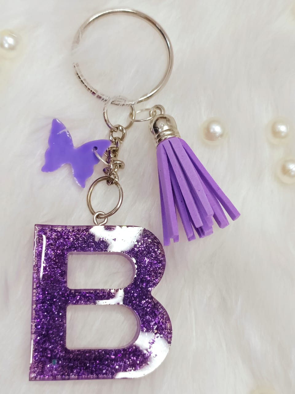 Haute Crafts Purple ("B")- with Small Butterfly & Purple Tessel Resin Alphabet Initial Letter Keychain Key Ring for Women Girls Purse Handbags, Bike, Car Keyring ("B")