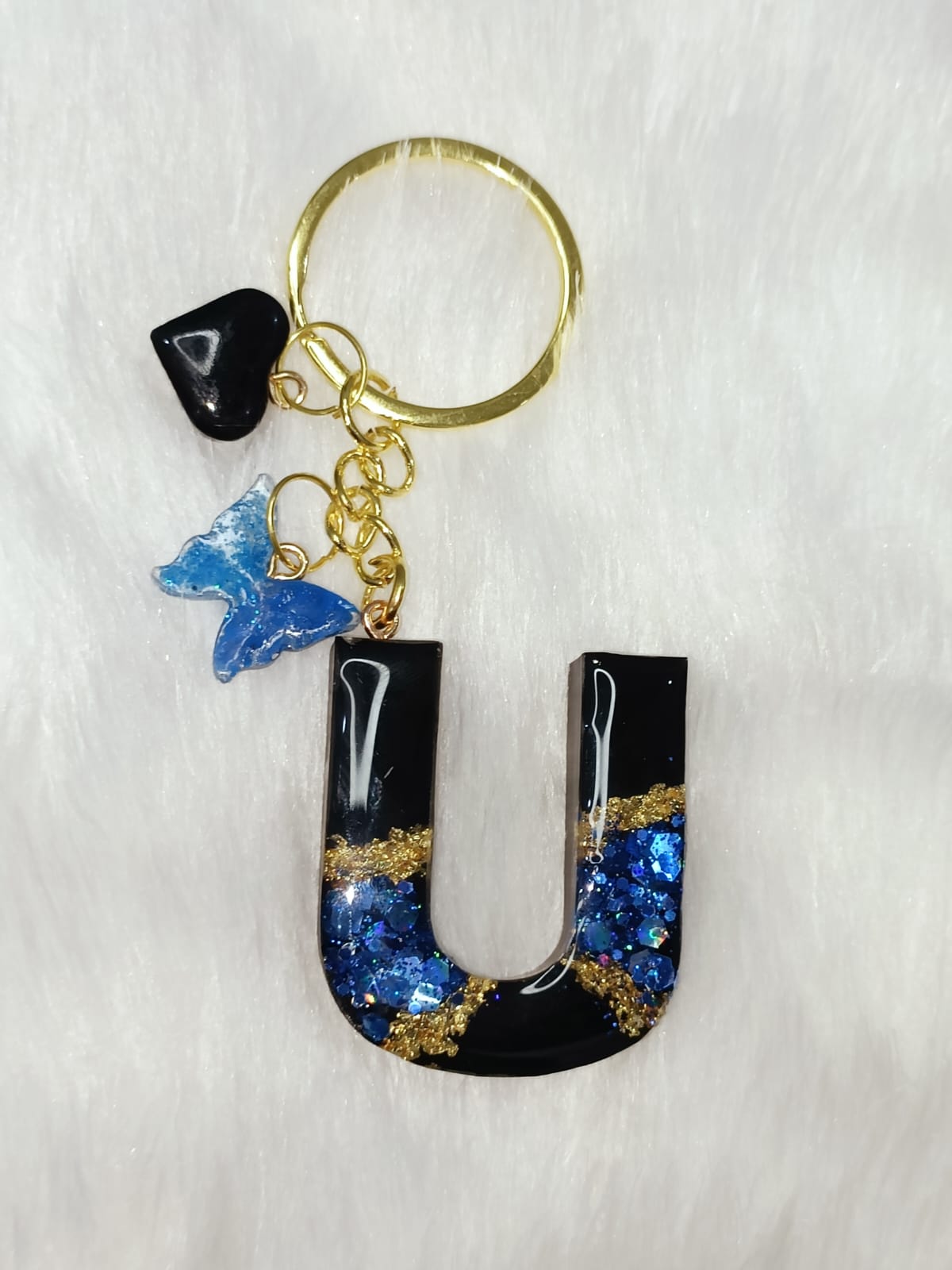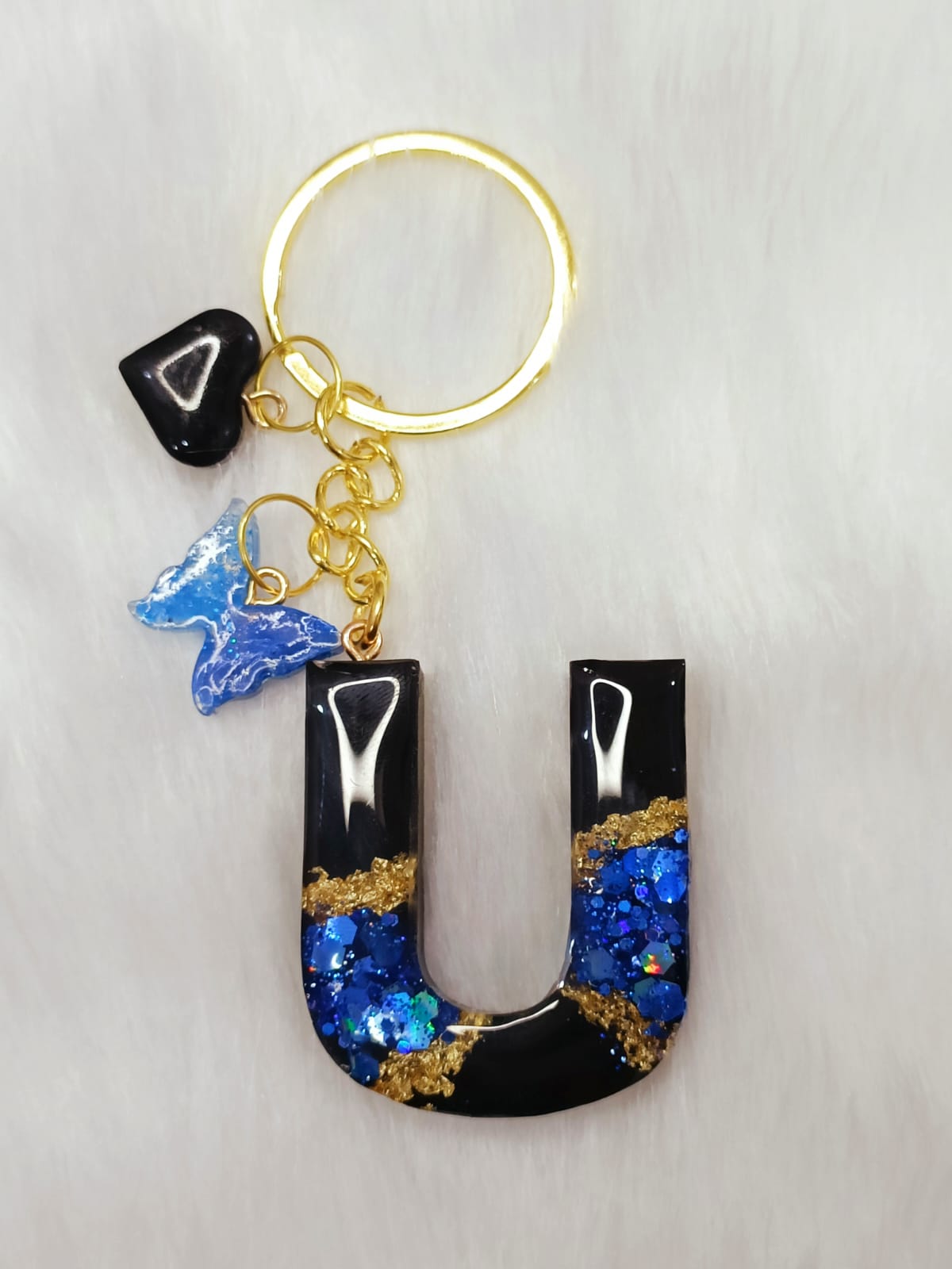 Haute Crafts Shiny Blue & Black With Small Heart & Butterfly ("U") Resin Alphabet Initial Letter Keychain Key Ring for Women Girls Purse Handbags ("U")