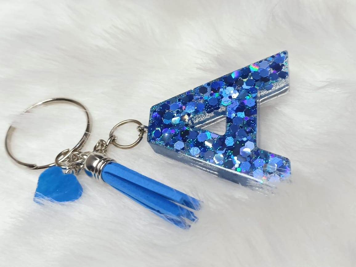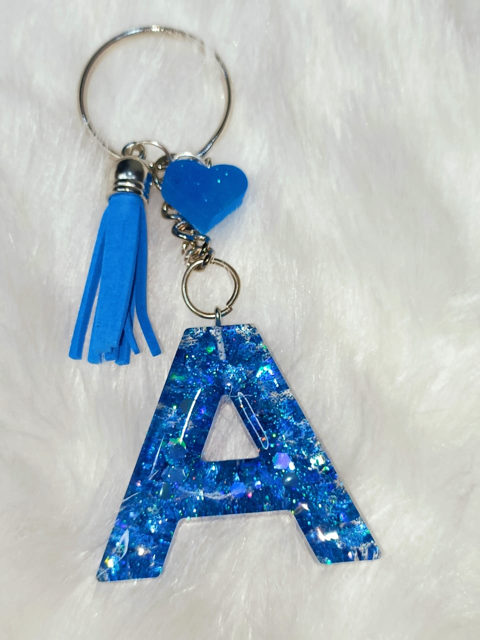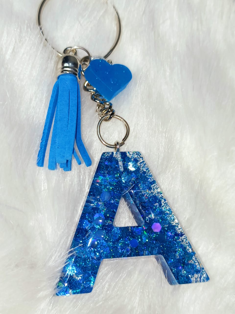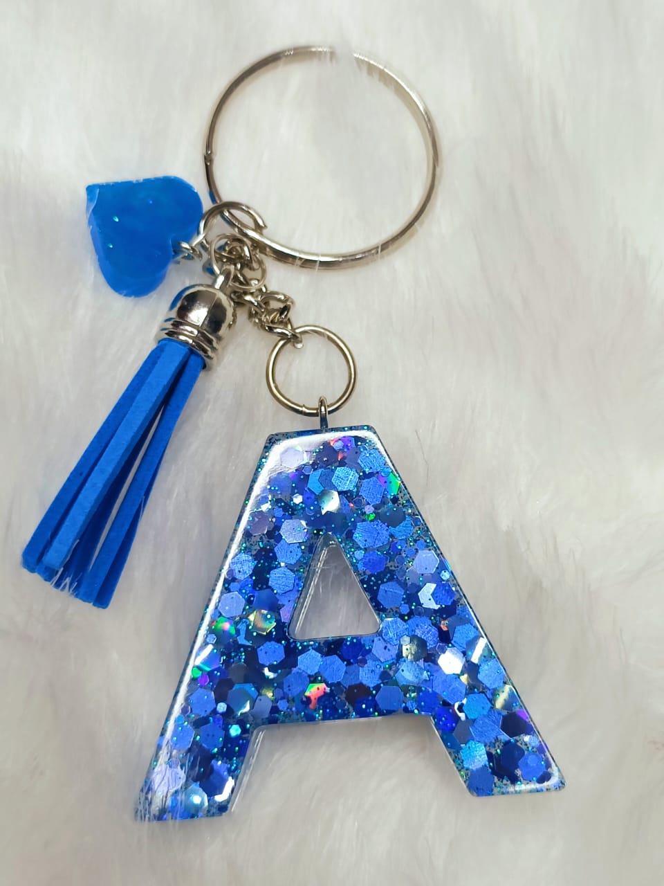 Haute Crafts Shiny Glittery Blue ("A")- with small Heart & Blue Tassel, Resin Alphabet Initial Letter Keychain Key Ring for Women Girls Purse Handbags, Bike, Car Keyring ("A")