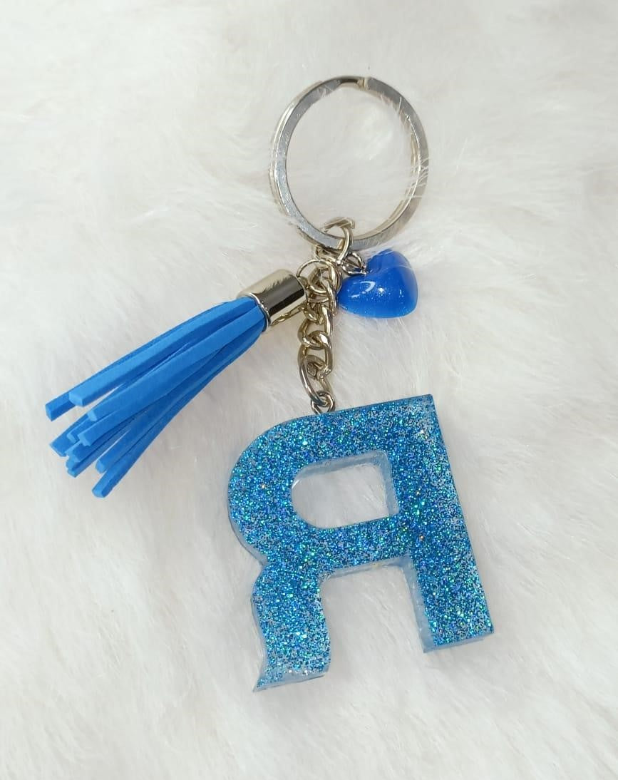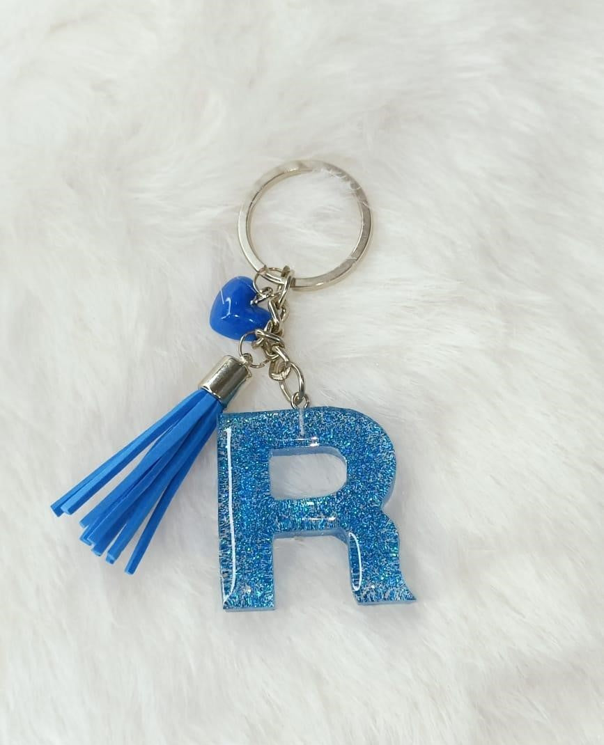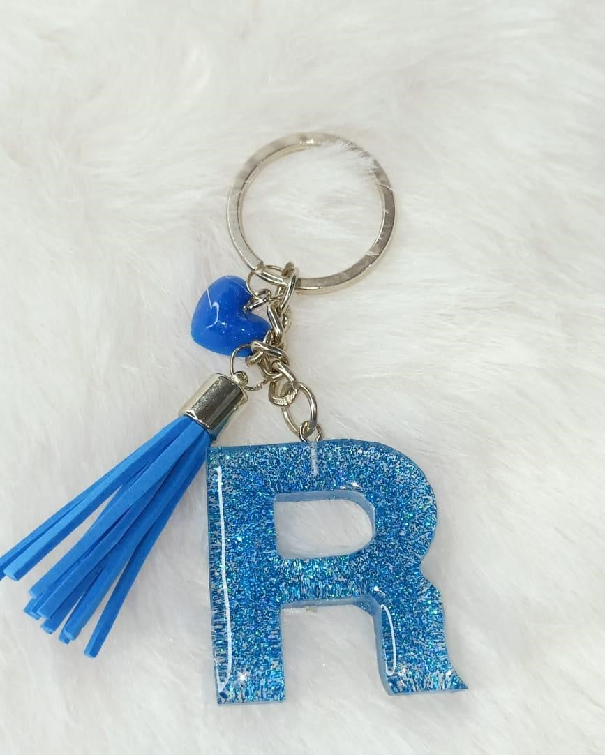 Haute Crafts Shiny Glittery Blue ("R")- with small Heart & Blue Tassel, Resin Alphabet Initial Letter Keychain Key Ring for Women Girls Purse Handbags, Bike, Car Keyring, Home, Small Gifts, ("R")