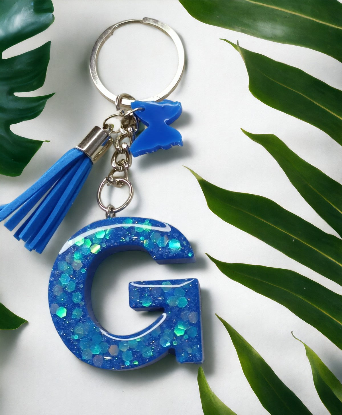 Haute Crafts Shiny Glittery Blue With Small Butterfly ("G") Resin Alphabet Initial Letter Keychain Key Ring for Women Girls Purse Handbags ("G")