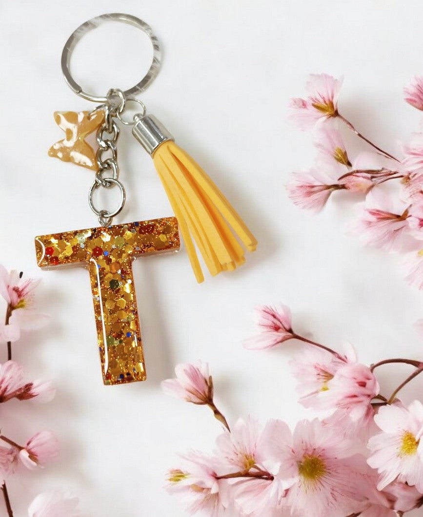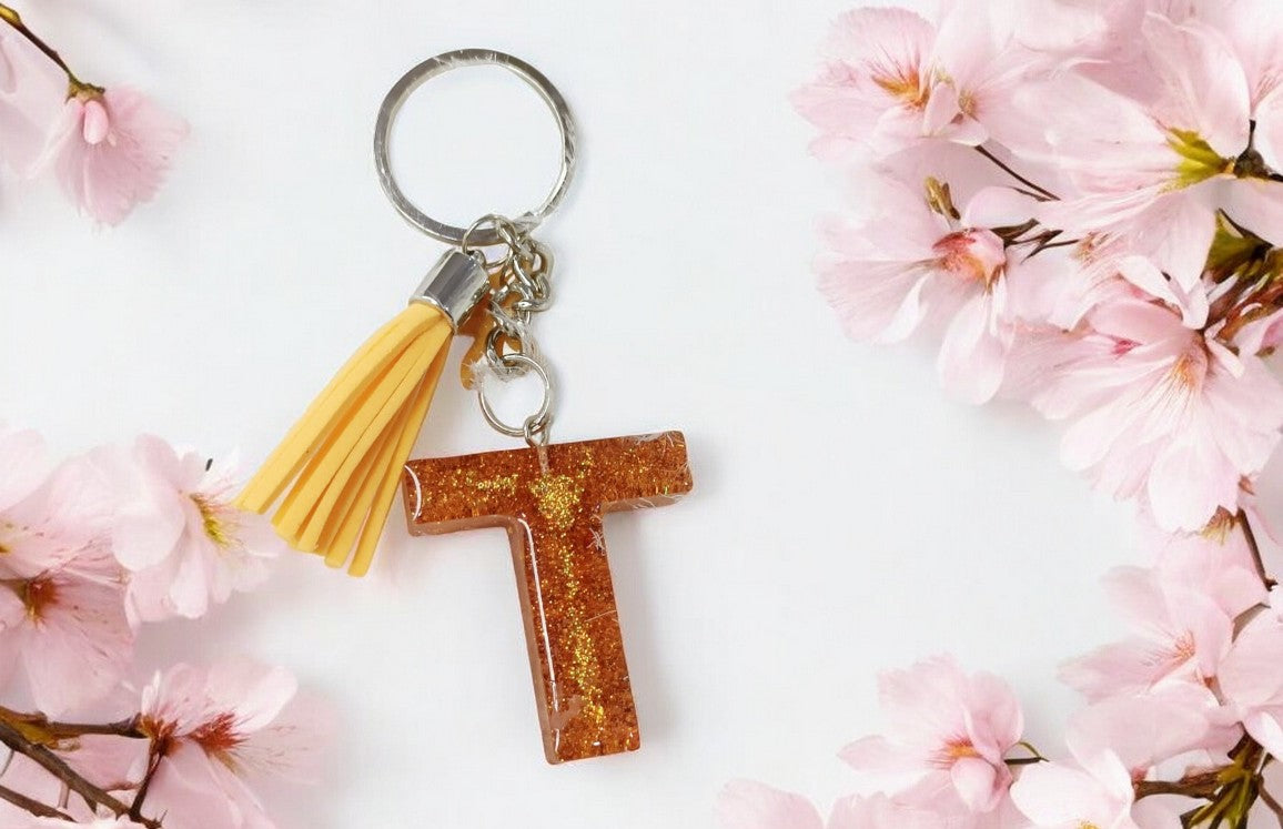 Haute Crafts Shiny Glittery Copper ("T")- with small Butterfly & Tassel, Resin Alphabet Initial Letter Keychain Key Ring for Women Girls Purse Handbags, Bike, Car Keyring ("T")