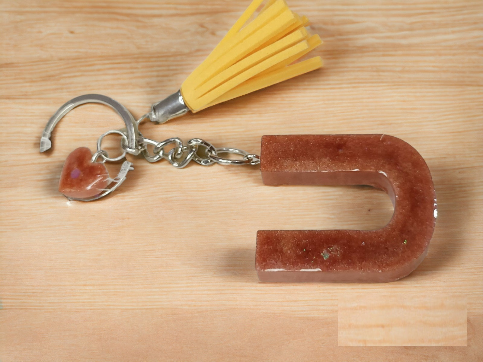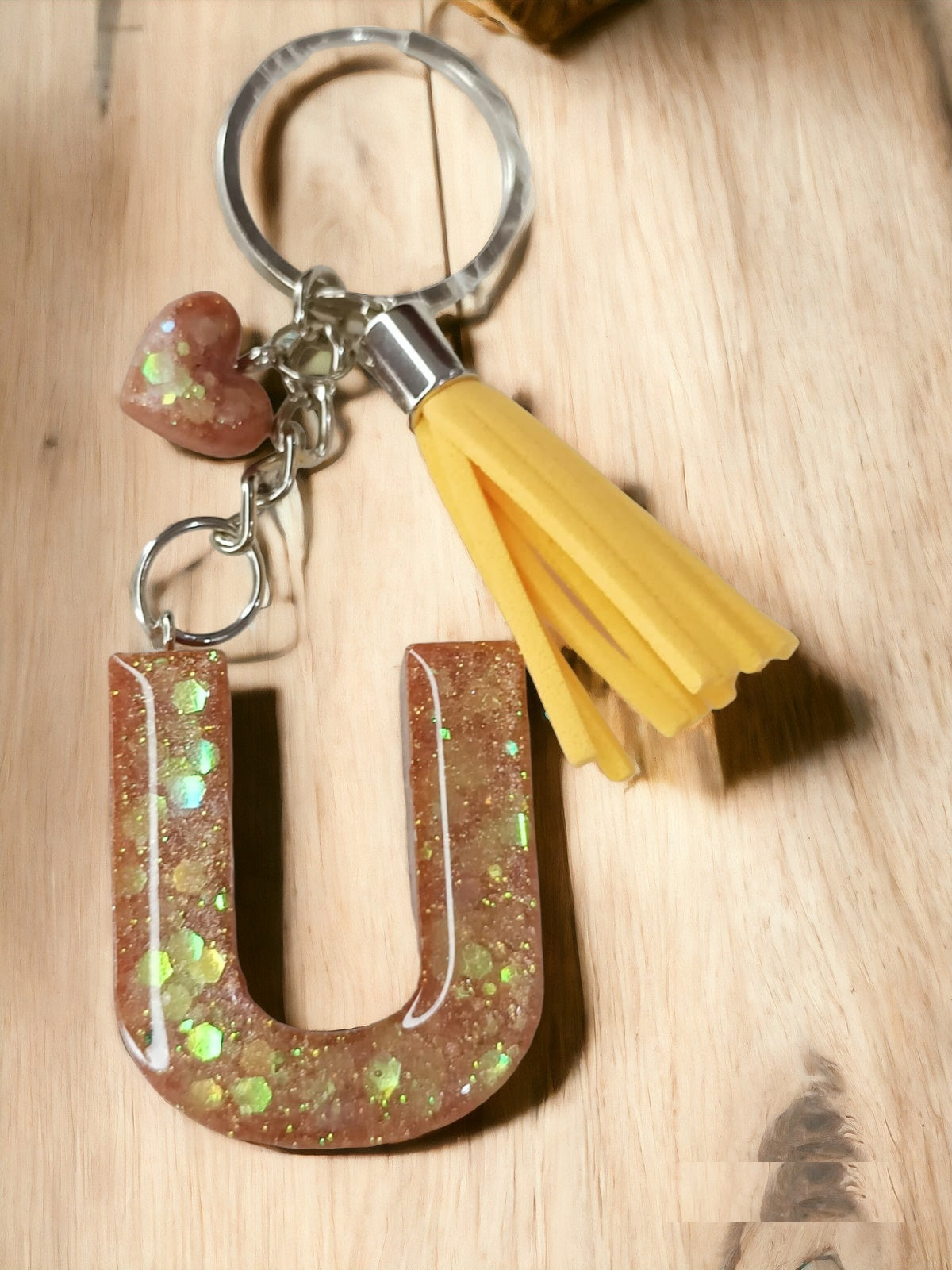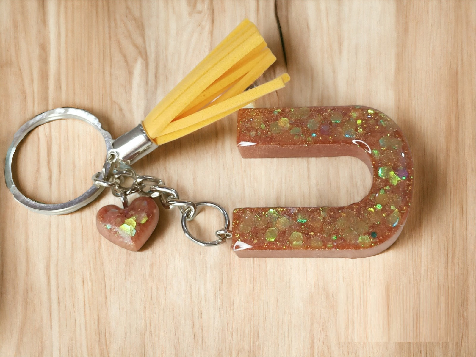 Haute Crafts Shiny Glittery Copper ("U")- with small Heart& Tassel, Resin Alphabet Initial Letter Keychain Key Ring for Women Girls Purse Handbags, Bike, Car Keyring ("U")