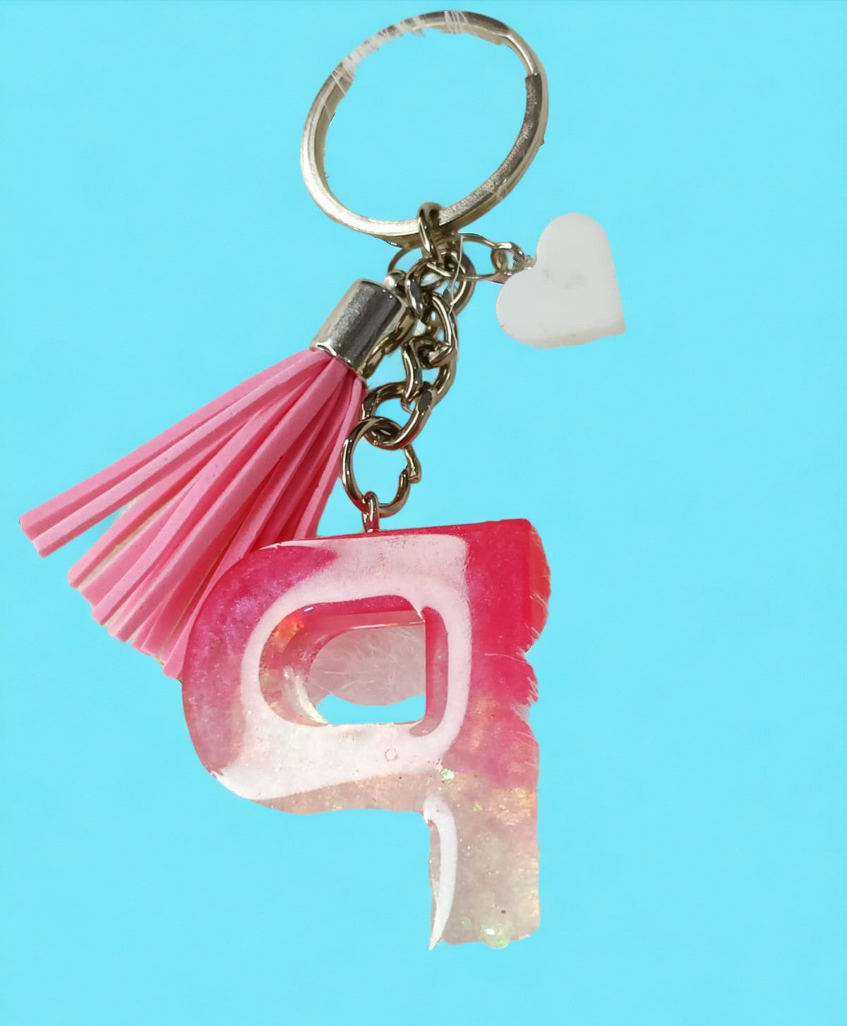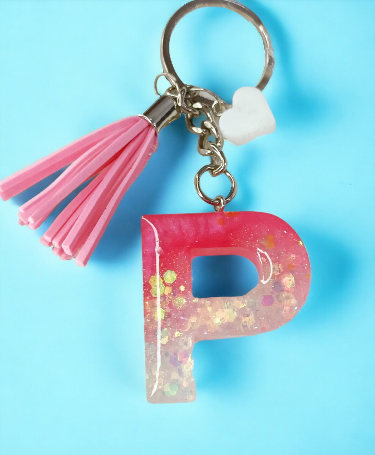 Haute Crafts Shiny Glittery Pink & White ("P")- with small heart & Tassel, Resin Alphabet Initial Letter Keychain Key Ring for Women Girls Purse Handbags, Bike, Car Keyring ("P")