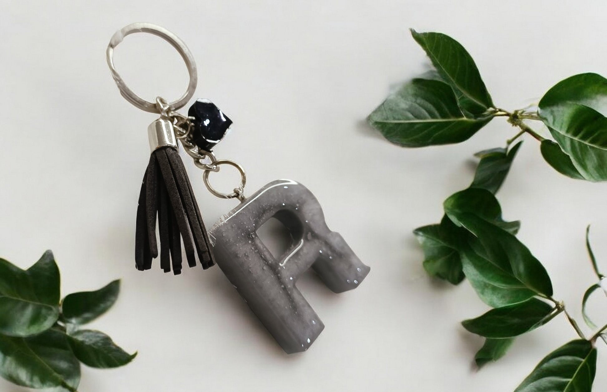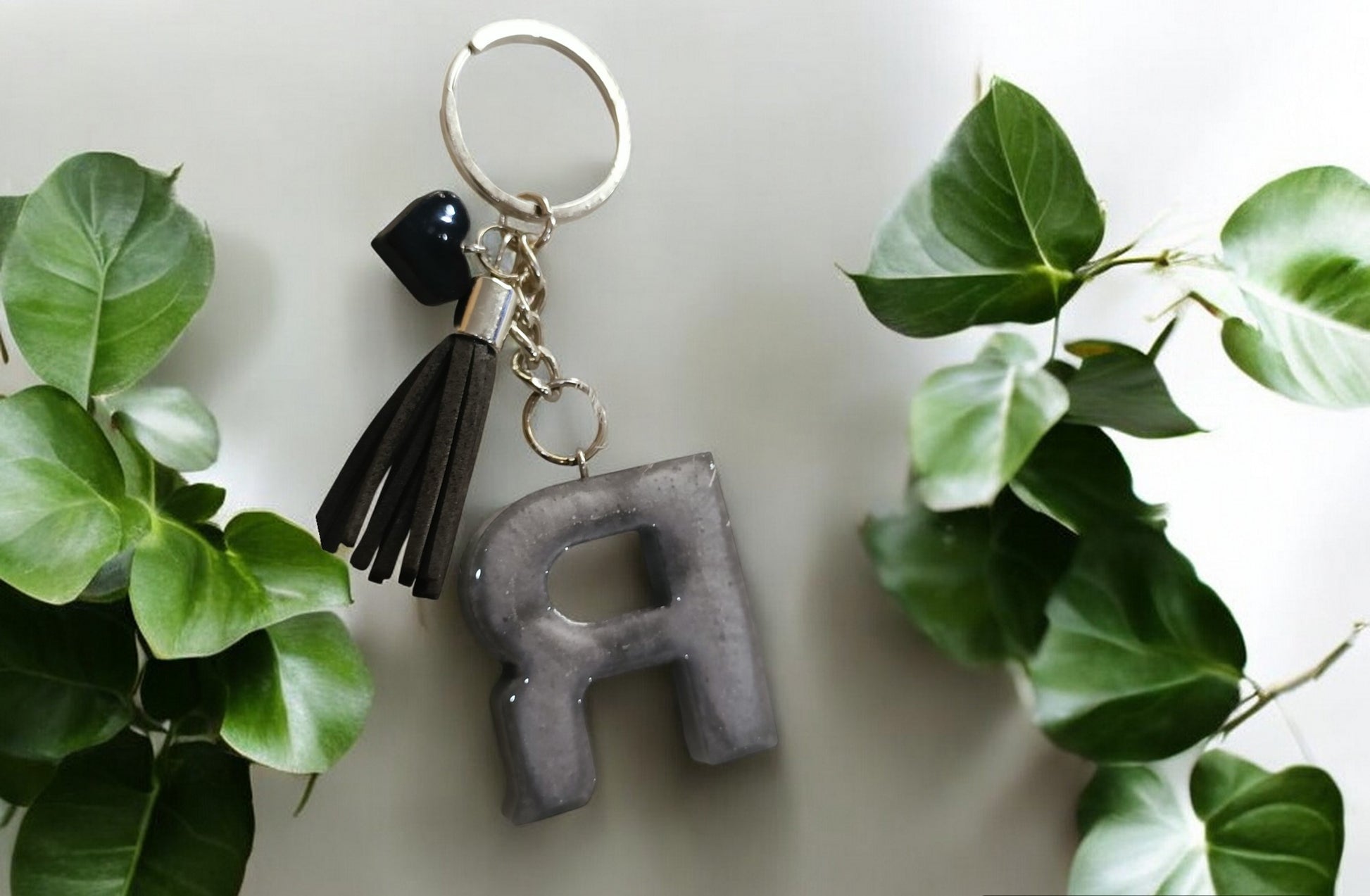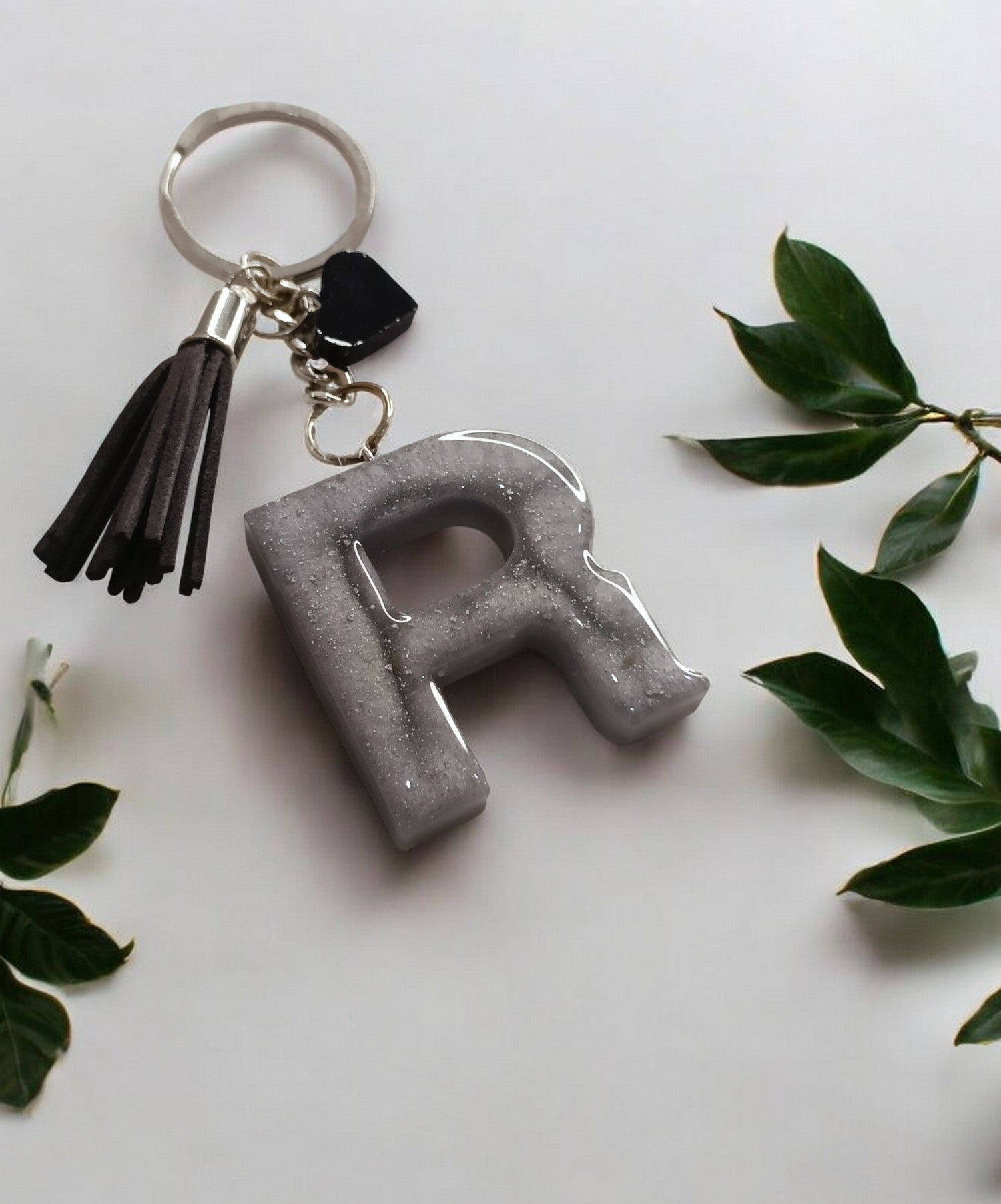 Haute Crafts Shiny Grey ("R")- with small Heart & Tassel, Resin Alphabet Initial Letter Keychain Key Ring for Women Girls Purse Handbags, Bike, Car Keyring ("R")