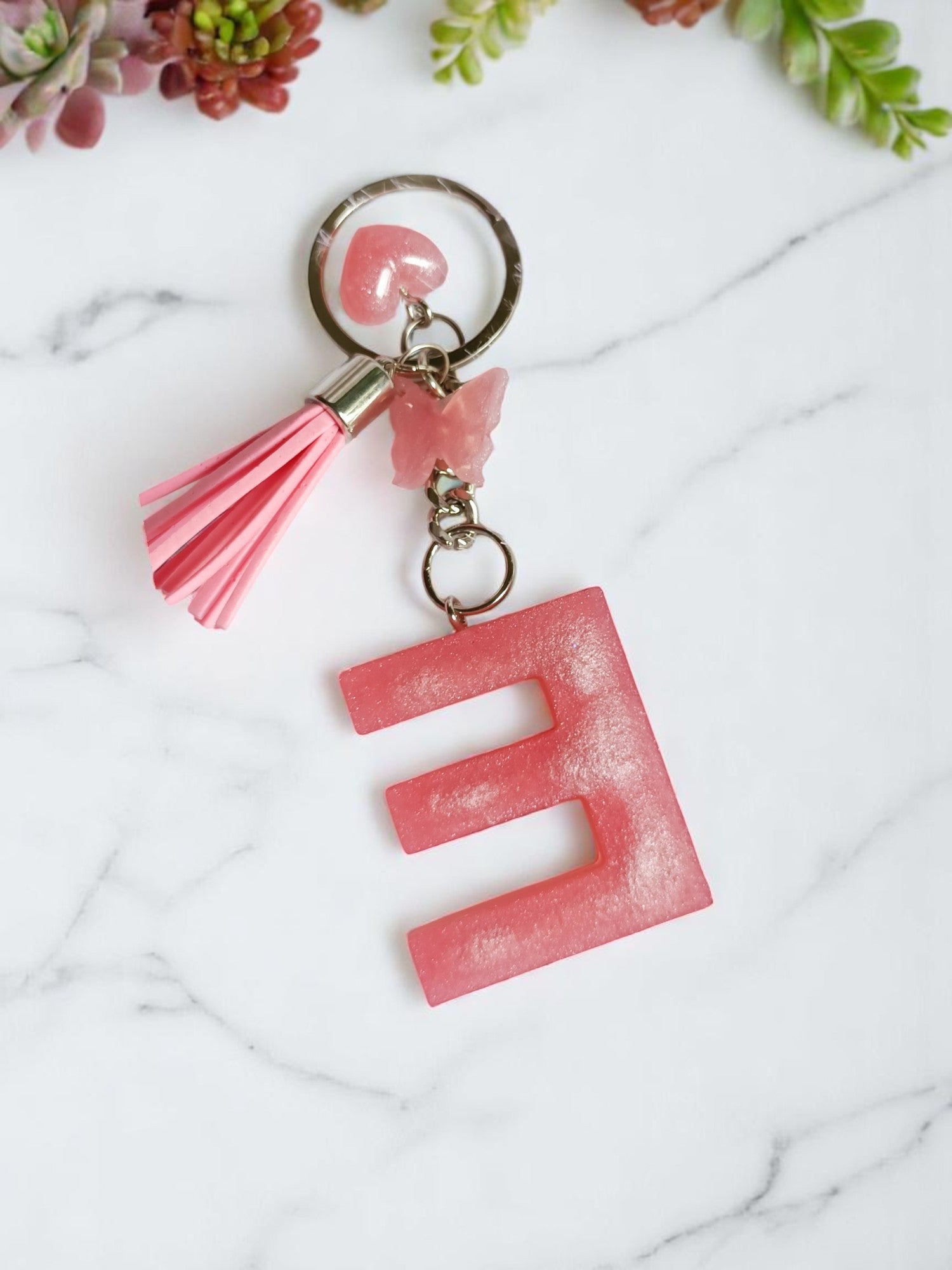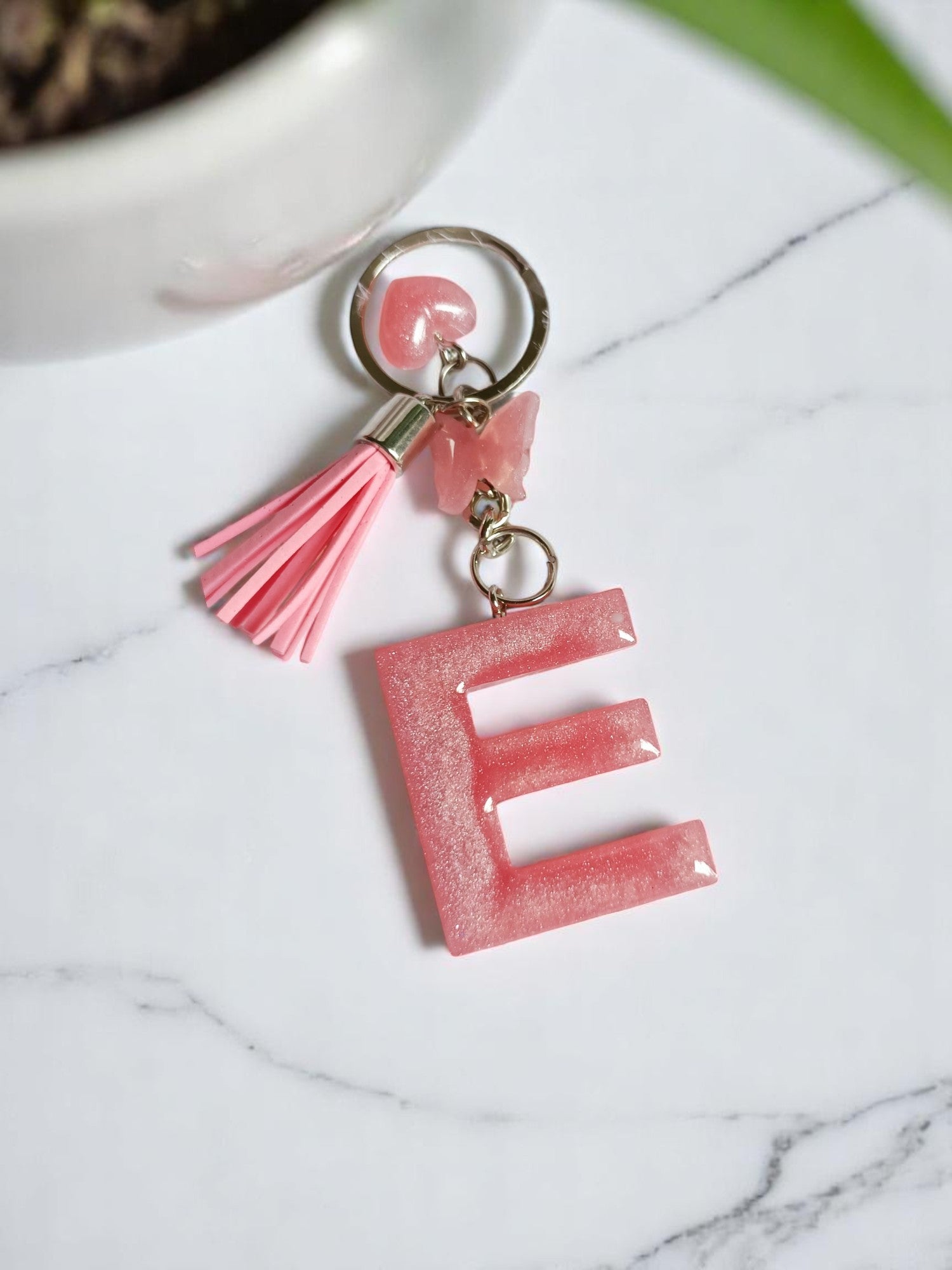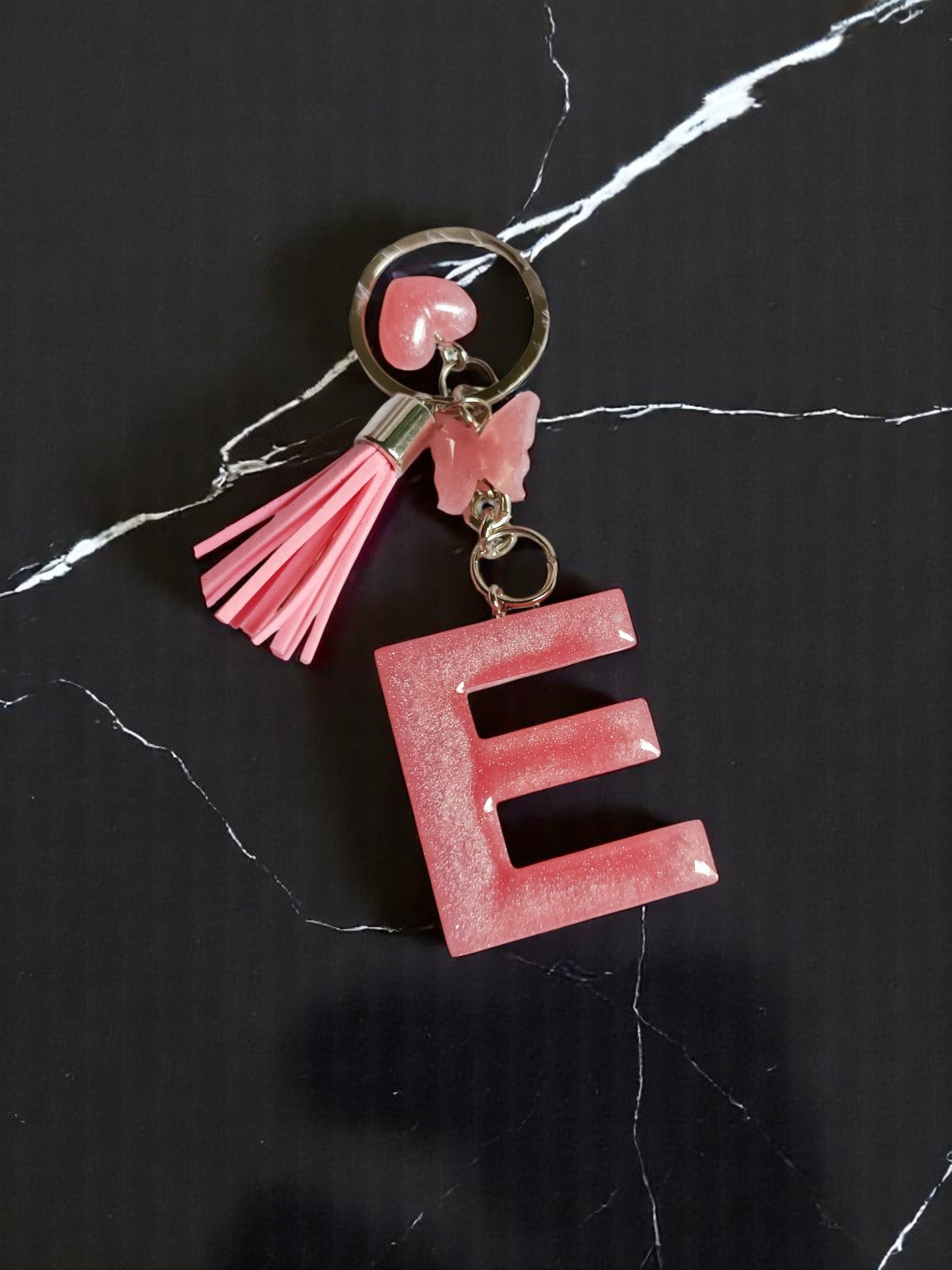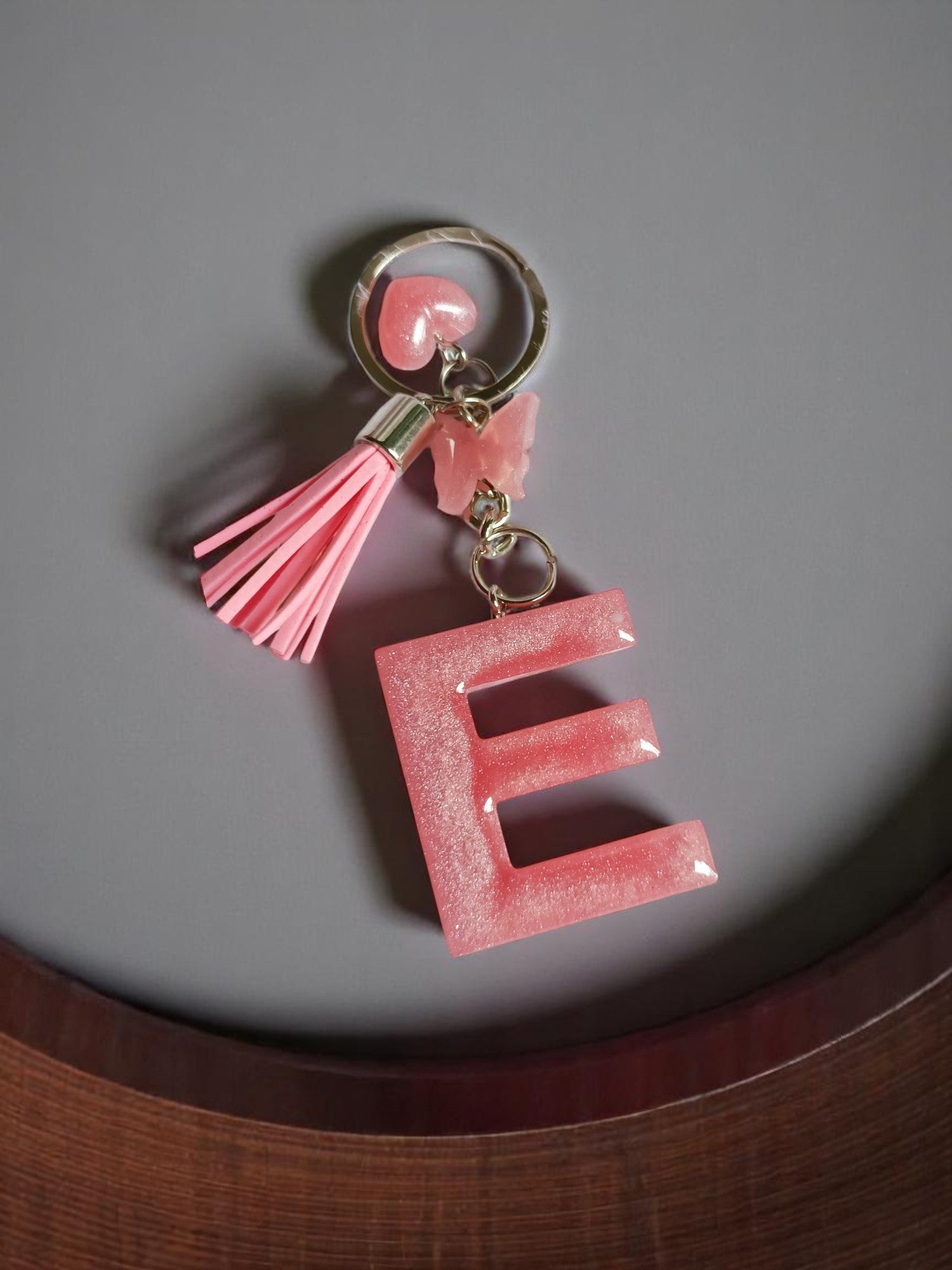Haute Crafts Shiny Pink ("E") with Small Heart and Tassel & Butterfly Resin Alphabet Initial Letter Keychain Key Ring for Women Girls Purse Handbags, Bike, Car Keyring ("E")