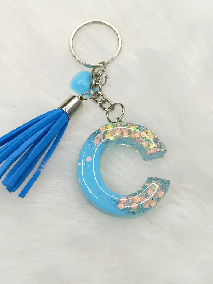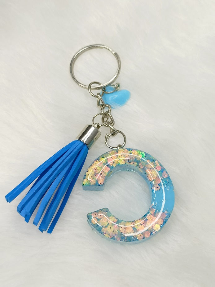 Haute Crafts Shiny Sky Blue ("C")- with small Heart & Tassel, Resin Alphabet Initial Letter Keychain Key Ring for Women Girls Purse Handbags, Bike, Car Keyring ("C")