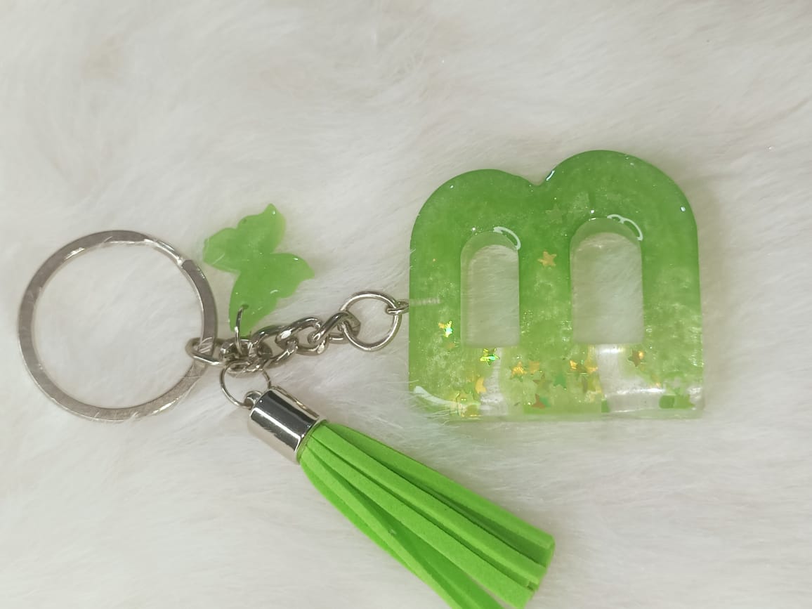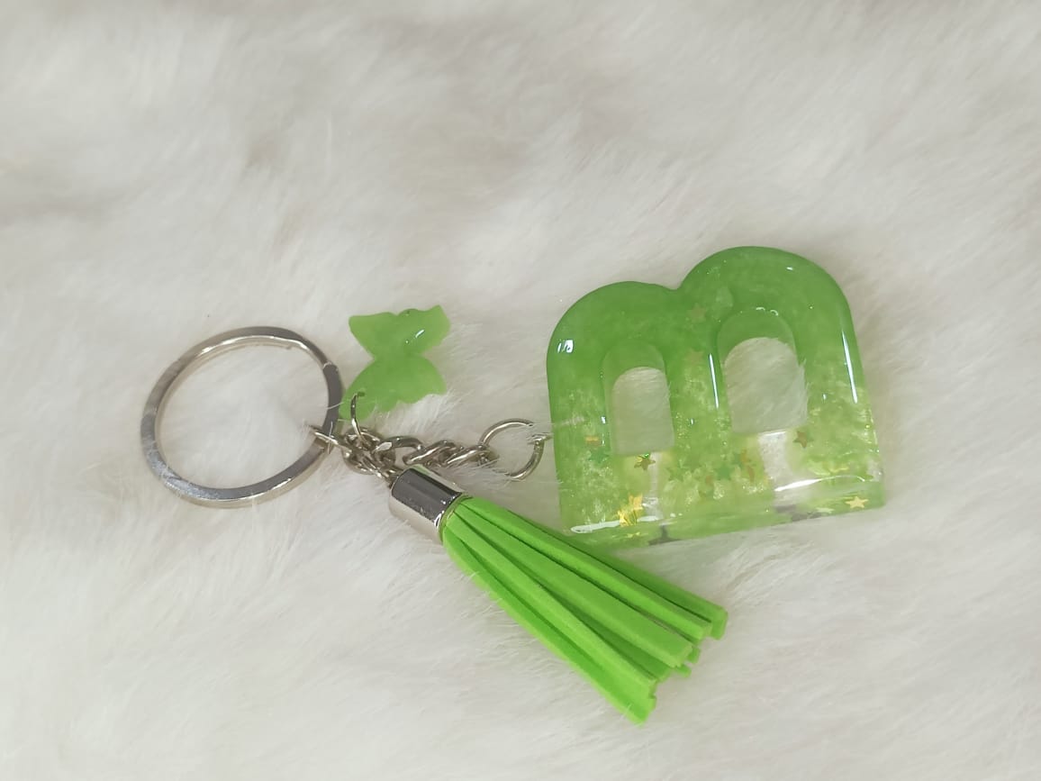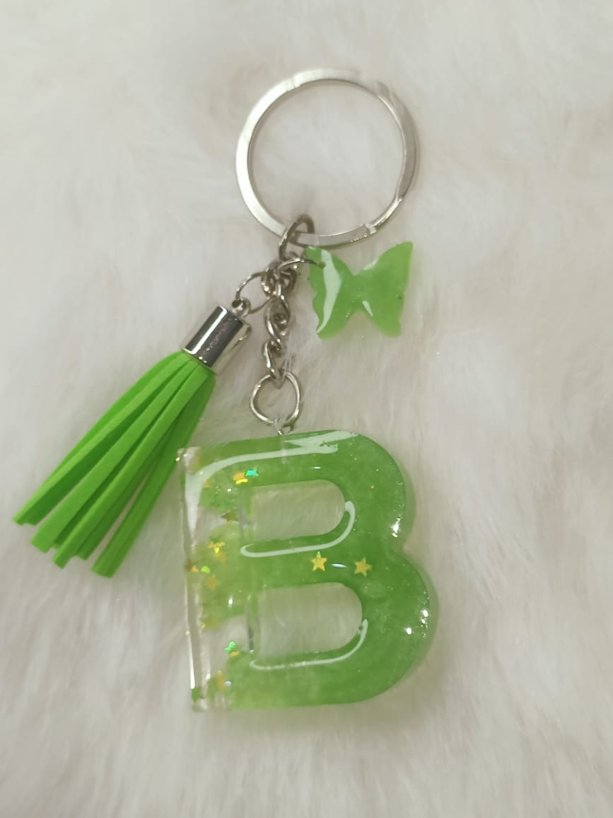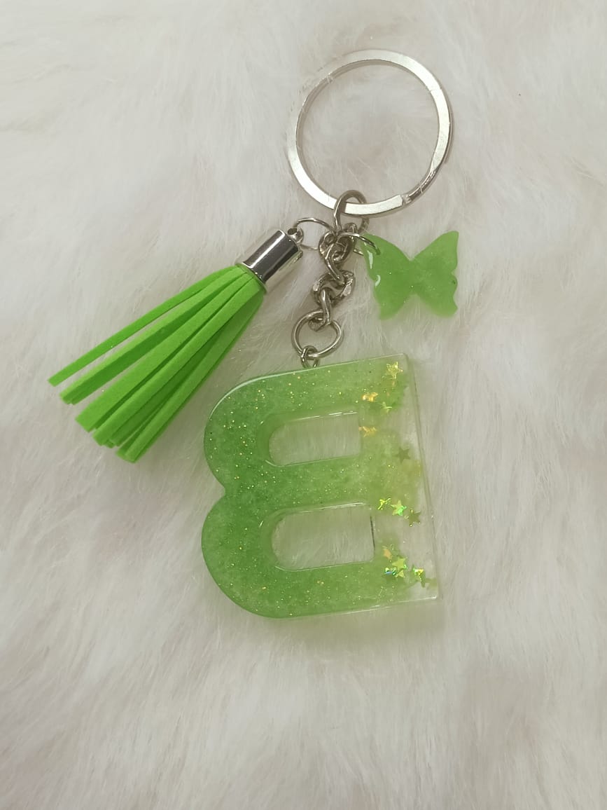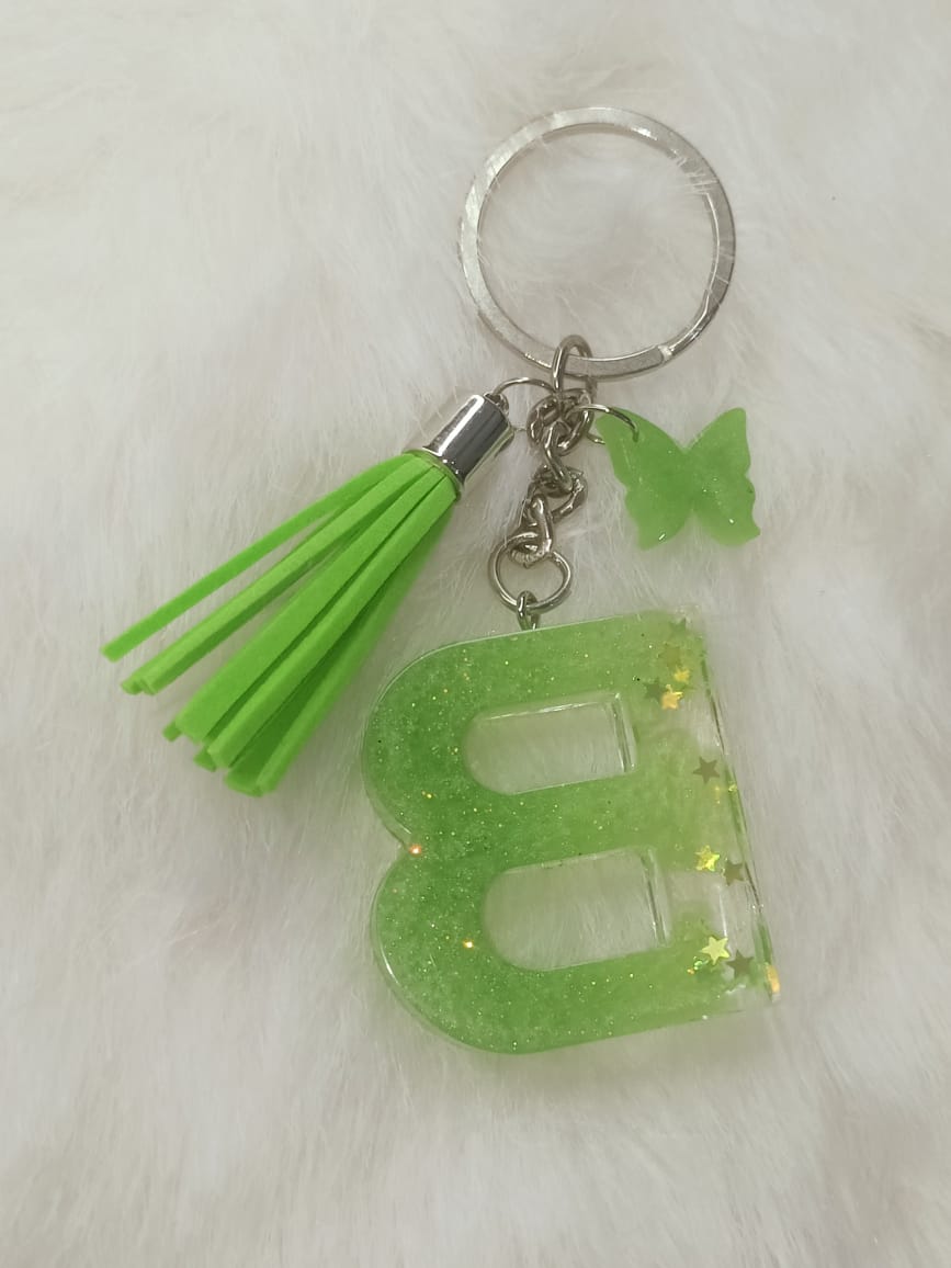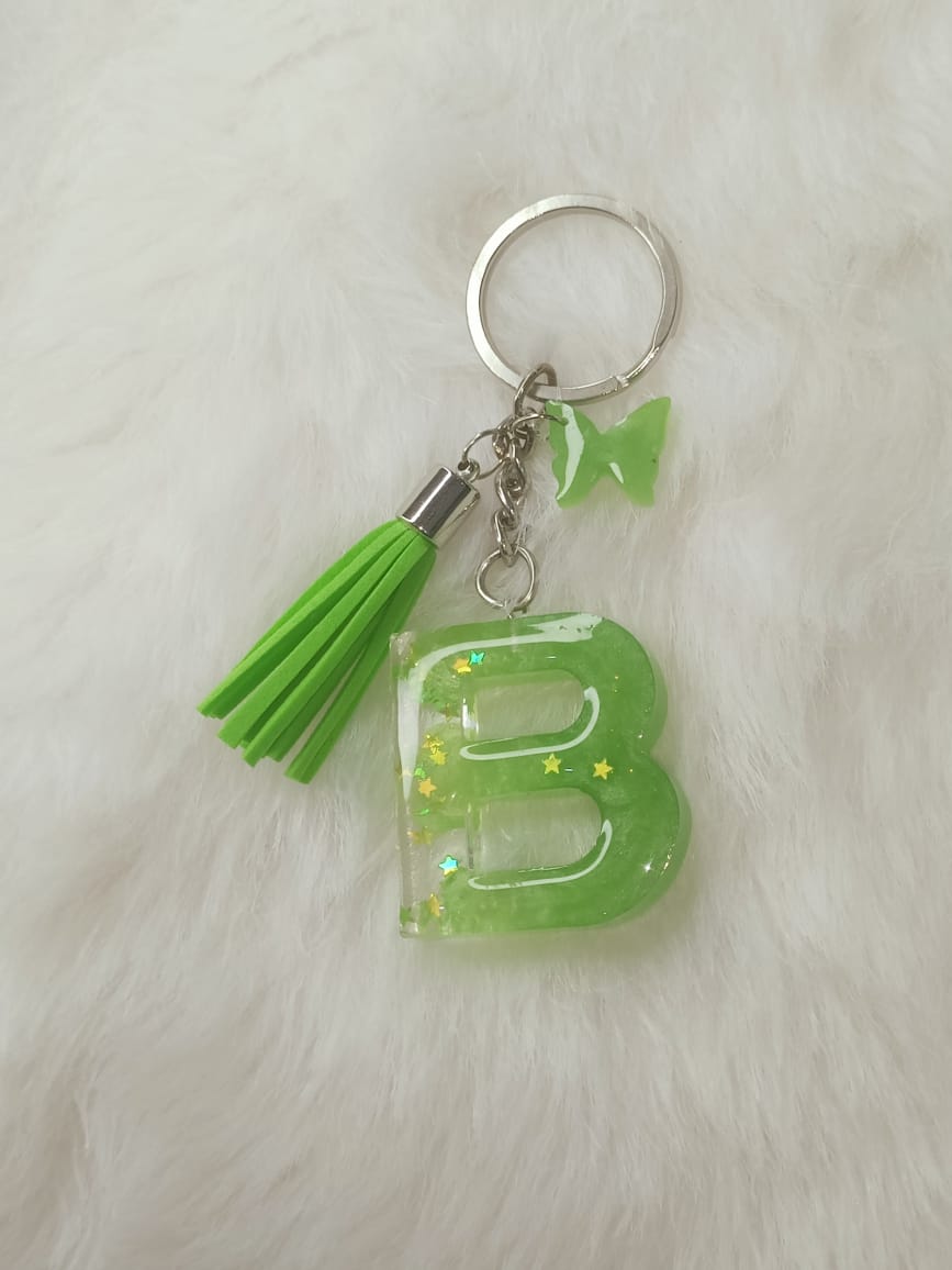 Haute Crafts Shiny Star Light Green ("B")- with small Butterfly & Green Tassel, Resin Alphabet Initial Letter Keychain Key Ring for Women Girls Purse Handbags, Bike, Car Keyring, Small Gifts, Home, ("B"