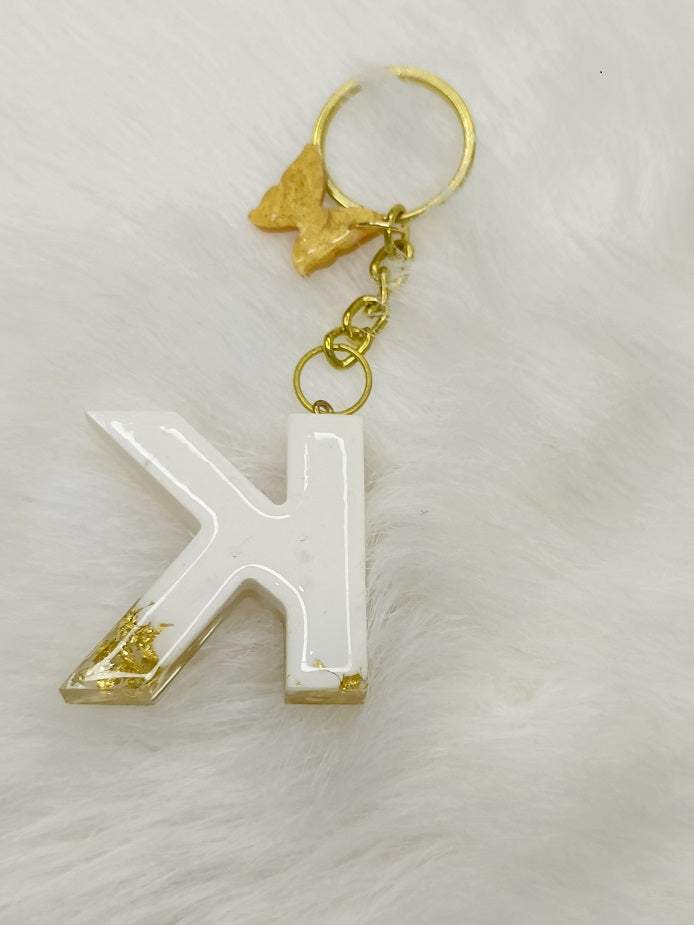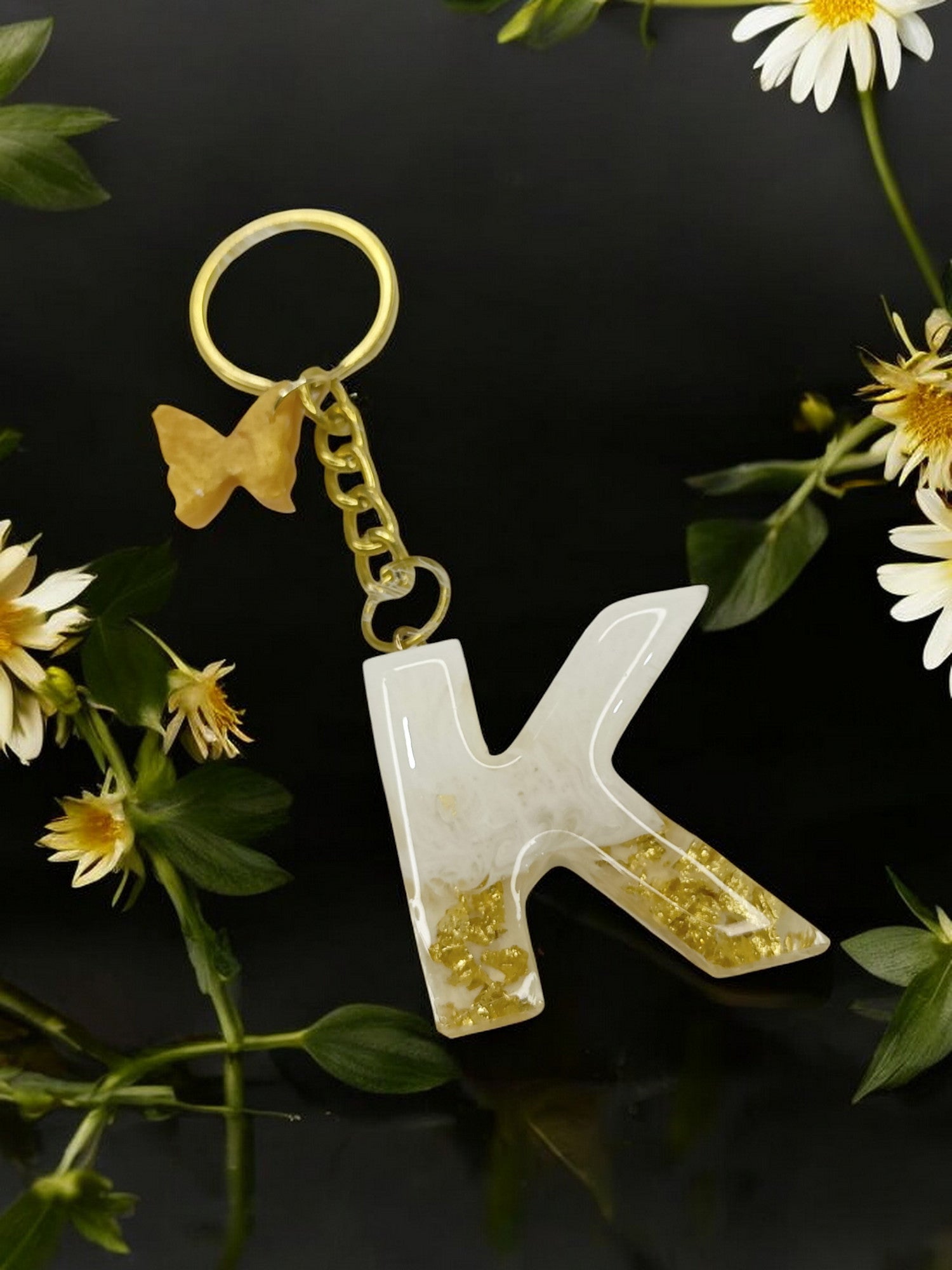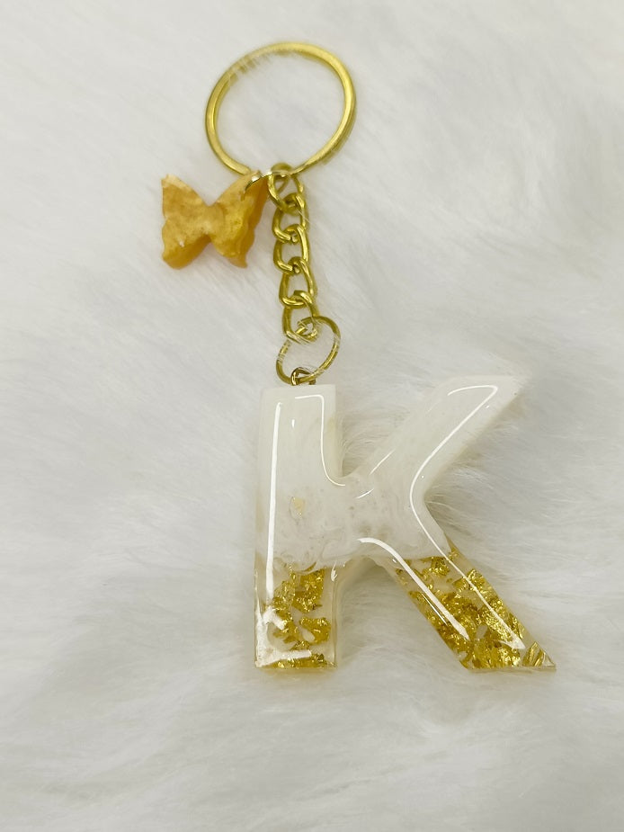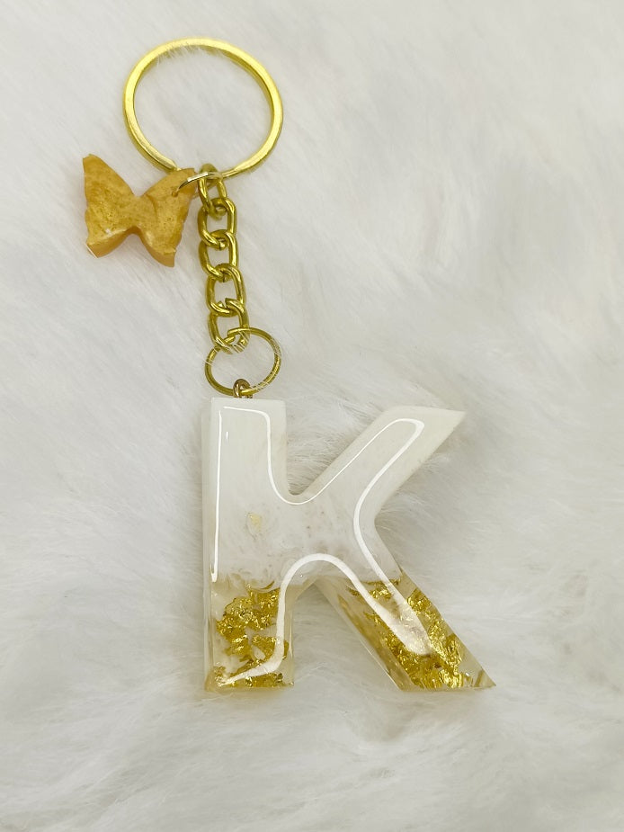 Haute Crafts Shiny White & Golden("K")- with small Butterfly , Resin Alphabet Initial Letter Keychain Key Ring for Women Girls Purse Handbags, Bike, Car Keyring ("K")
