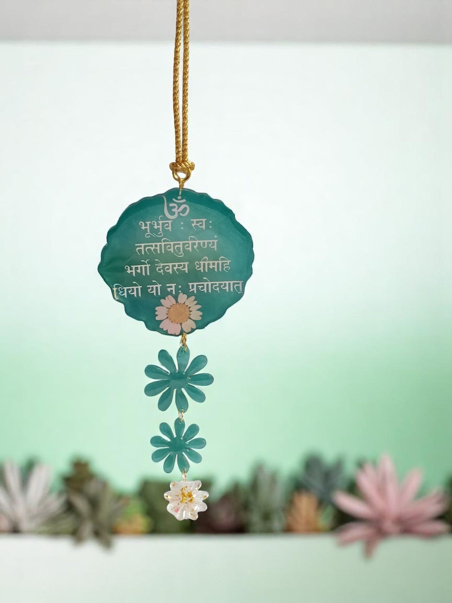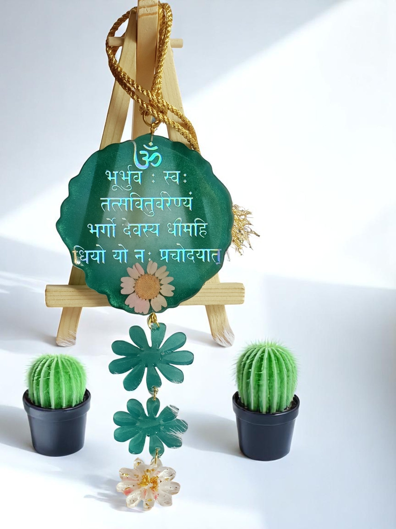 Special handmade Gayatri Mantra Resin art car hanging which can be used in the car or it can be hanged anywhere like in office or Home. This is purely art experience itself